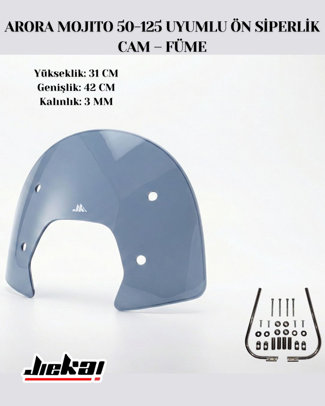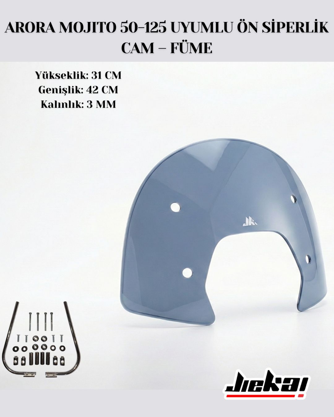 Scooter sürüşlerinde hem rüzgâr hem de dış etkenlerden korunmak isteyenler için ideal! JİEKAİ markasının Mojito 50-125 modelleriyle uyumlu füme ön siperlik camı, şık tasarımıyla motosikletinizin görünümünü tamamlar, konforlu bir sürüş deneyimi sunar.
