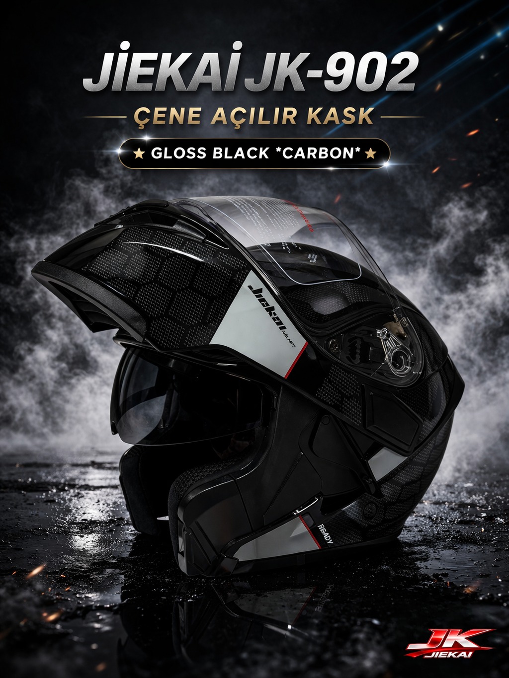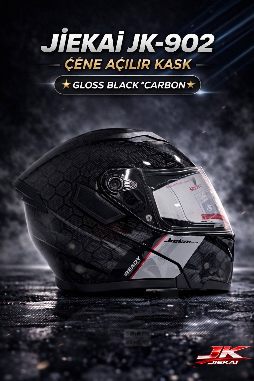 JIEKAI JK-902, motosiklet sürücülerinin ihtiyaçlarına yönelik geliştirilmiş çene açılır mekanizması ile hem kapalı kask güvenliğini hem de açık kask rahatlığını sunar. GLOSS BLACK CARBON ile modern ve minimalist bir görünüme sahip olan bu model, çene pedi ile ekstra konfor sağlar.