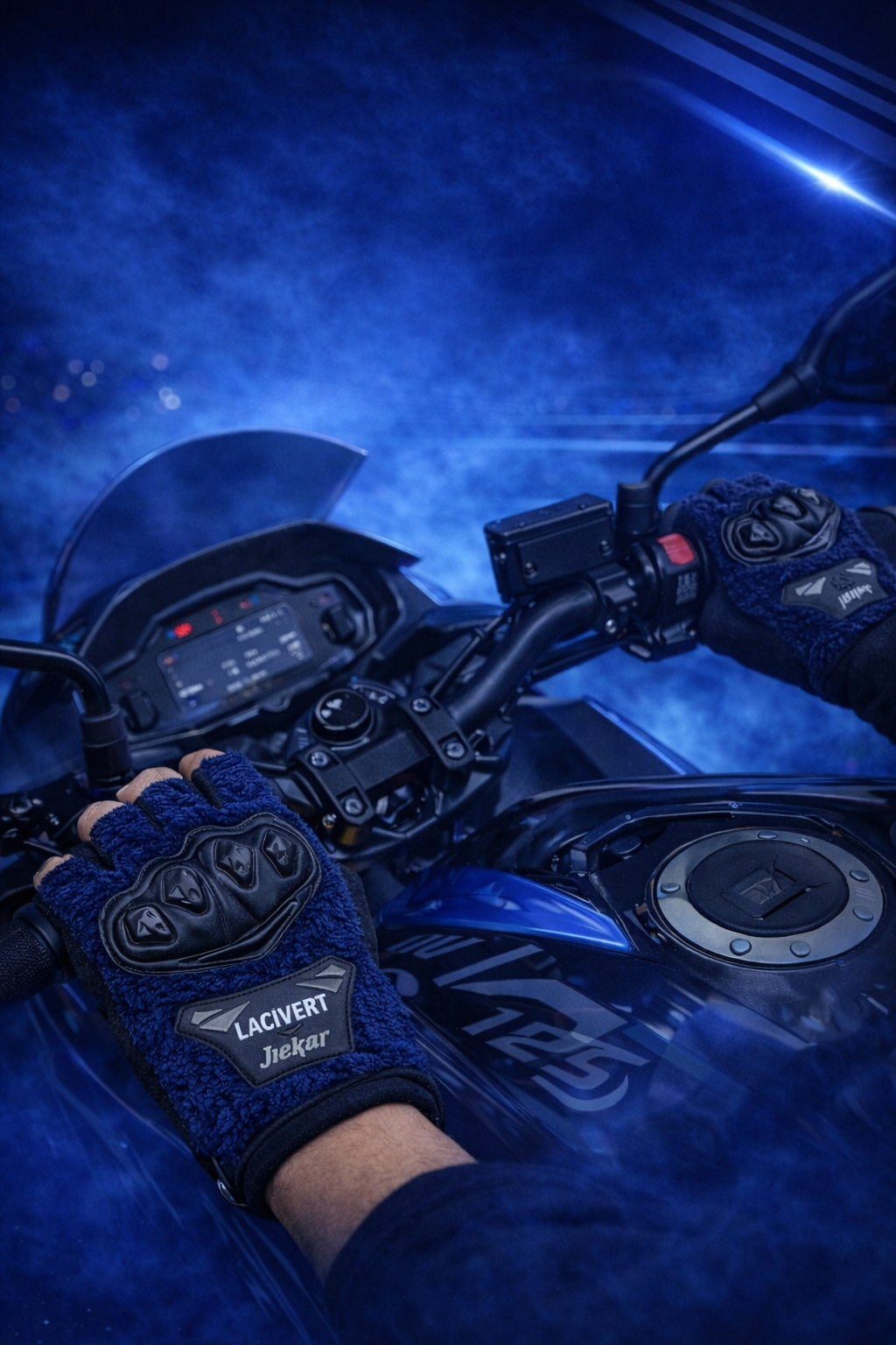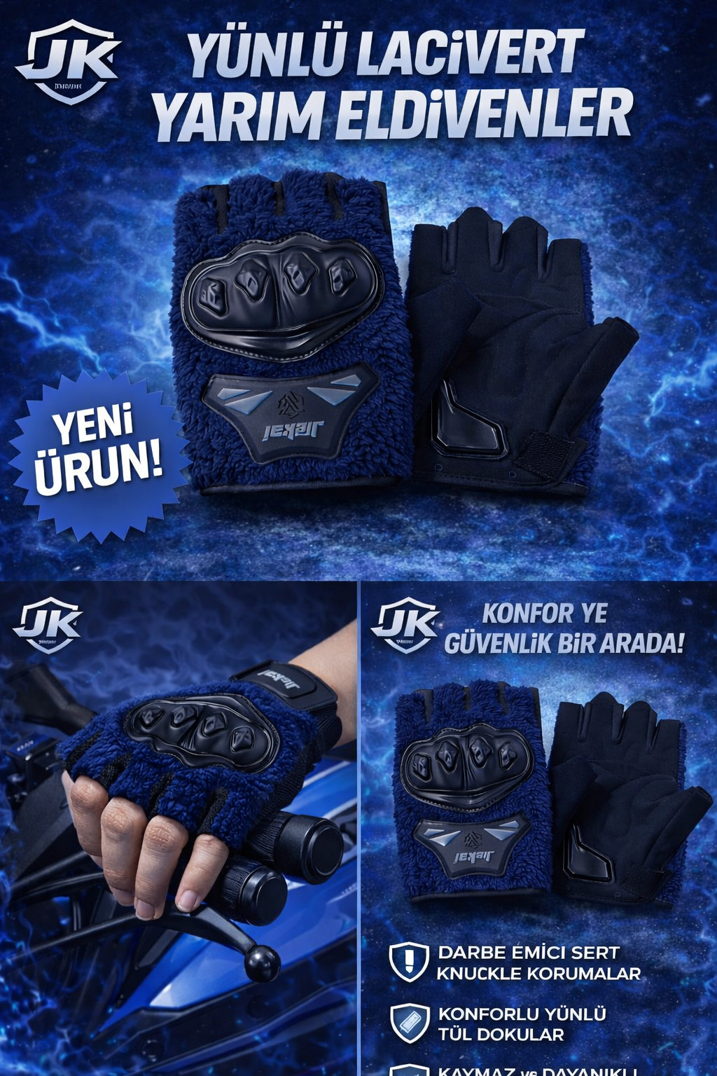 JK Peluşlu Yarım Eldiven, soğuk ve rüzgârlı havalarda sürüş konforunu artırmak, aynı zamanda şık ve güçlü bir görünüm sunmak için özel olarak tasarlanmıştır. Zamansız ve asil lacivert rengi, hem sportif hem de klasik motosiklet ekipmanlarıyla mükemmel uyum sağlar. Günlük kullanım ve motosiklet sürüşleri için ideal bir üründür.
